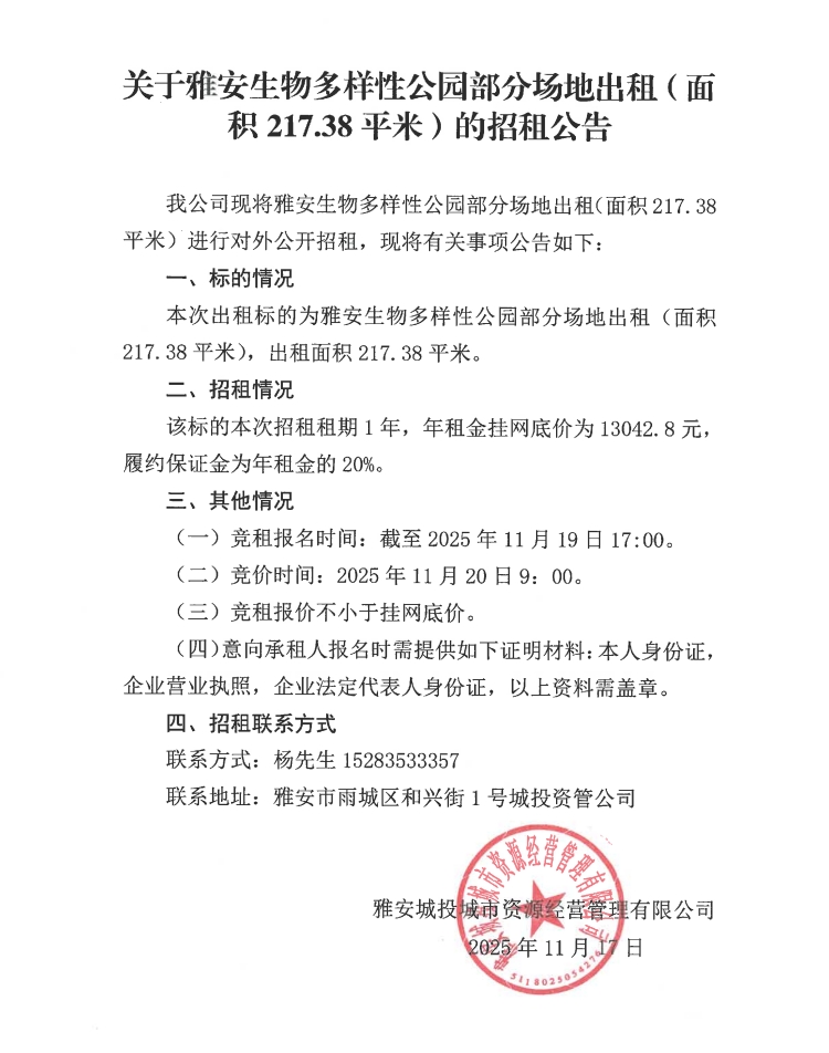 關(guān)于雅安生物多樣性公園部分場地出租(面積217.38平米)的招租公告