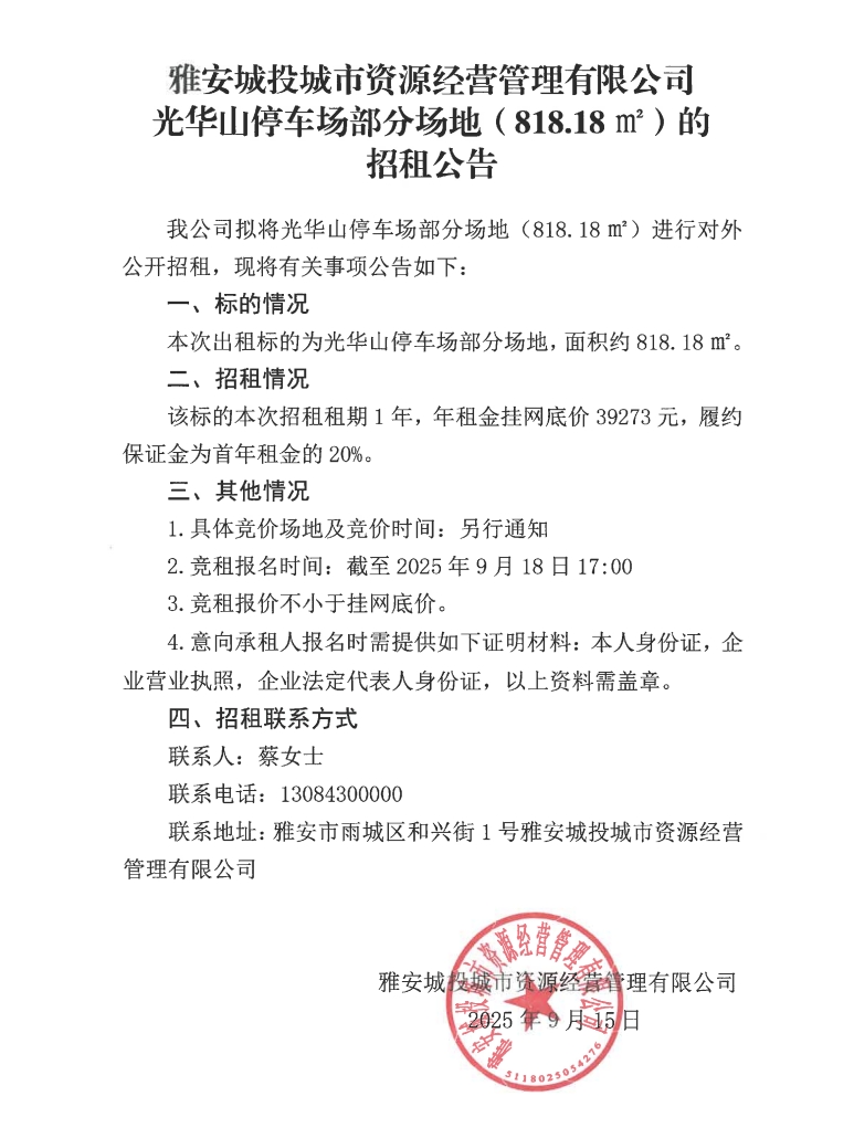 雅安城投城市資源經(jīng)營管理有限公司光華山停車場部分場地(818.18㎡)的招租公告